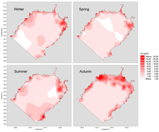 In winter, the distribution of Cu was relatively uniform due to the strong north wind-induced dispersion effect. A high-level area appeared from Daliaohe Estuary to Bayuquan Port, where contaminants accumulate under the action of seasonal circulation. The level of Cu was low in spring, and the concentration in most sea areas was less than 3 μ g/L due to a long low-input season of half a year. The spatial distribution was similar in summer and spring, with high levels in the sea west of Yingkou. After the wet season, the concentration of Cu increased to up to 5.91 μg/L, due to large loads in river runoff.