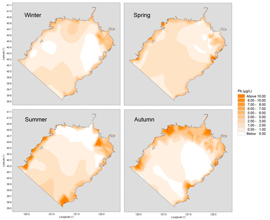 As shown in Figure 5, Pb concentration was relatively high in summer and autumn, and was lowest in winter. The spatial patterns were similar in winter and spring, and the distribution was even in the offshore waters. In summer, the distribution trend was high on the east and west coast and low in the offshore area. Coastal industry sewage discharge and anthropogenic emissions greatly affected Liaodong Bay in the summer, and the extent of Pb pollution in the inshore area was apparently higher than in the offshore area. During autumn, riverine discharge dominated the input of Pb into the marine environment, causing high concentrations near the northern bay head and lower ones at the broad area around the outlet of the bay.