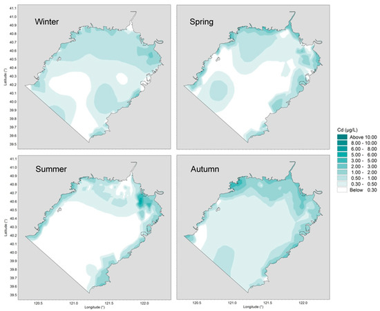 Cd concentration in autumn was evidently higher than in the other seasons. This was the result of increased metal concentration in river runoff after the wet season. The riverine Cd load in coastal waters was concentrated at the head of the bay and dispersed to the whole bay throughout the autumn due to the action of northerly wind. Due to continuous low riverine Cd exports to coastal waters, the levels decreased continuously from winter to summer in open seas less affected by runoff. Cd concentration in Jinzhou Bay, a sub-bay located in the northwest corner of Liaodong Bay, maintained over 1 μg/L all year round, because of local long-term industrial sewage discharge.
