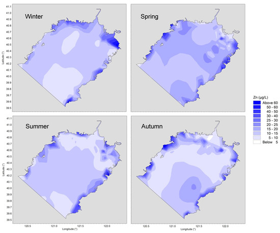 As shown in Figure 7, high concentrations of Zn appeared along both sides of the Liaodong Bay and low ones in the offshore area. The concentration in the open offshore was basically between 10–20 μg/L, while the average value near the inshore was not less than 20 μg/L in any season. Unlike the other three metals, the concentration of Zn at the head of the bay was lower than that in other areas. The primary reason was that the concentration of runoff into the water was not high and the large amount of river water volume played a diluting role during the wet season.