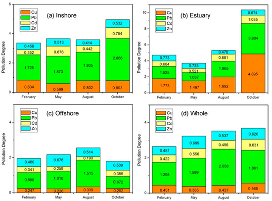 Pollution factors for dissolved heavy metals (Cu, Pb, Cd and Zn) in different regions of Liaodong Bay and for different months are presented in Figure 8. As a whole, the pollution level of Liaodong Bay was low, with PD values ranging from 2.649 to 3.684, according to the recommended value standards [17]. However, the regional diversity of heavy metal pollution in Liaodong Bay is relatively obvious.