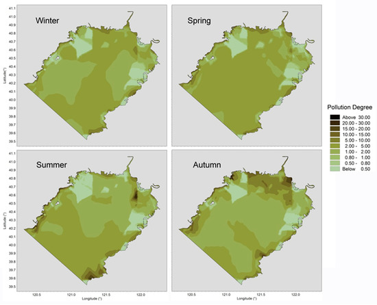 We identified the estuary at the head of Liaodong Bay as the most contaminated subarea with PD values ranging from 3.704 to 10.372. In autumn, pollution reached considerable levels with PD exceeding 10. The inshore pollution was second only to the estuary, which reflects that coastal discharge is also an important input source of heavy metals in Liaodong Bay. The stable emission intensity led to relatively slight seasonal changes. Due to strong dilution capacity and the long distance from the pollution sources, PD of the offshore area was less than 3.0 in any season, which presents a low pollution level with respect to heavy metals.