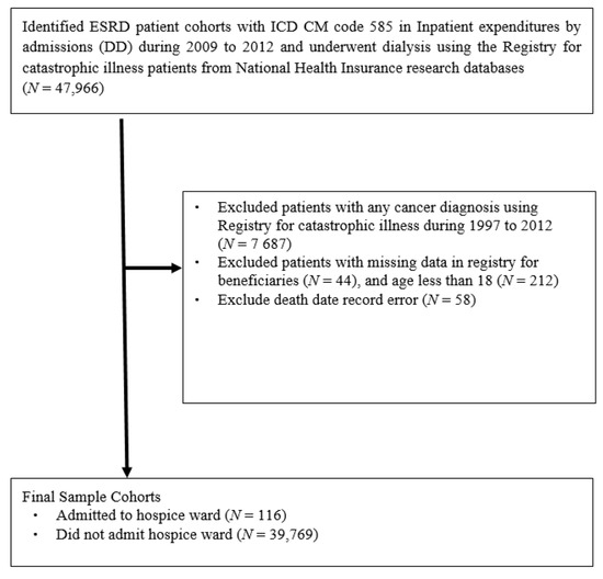 Using nationwide NHIRD claims data, we first included ESRD patients with a primary diagnosis code for CKD (ICD-9-CM code 585) for at least one inpatient hospitalization during the patient identification period, 1 January 2009 to 31 December 2012. We then used the registry of catastrophic illnesses to identify whether those patients received long-term dialysis before admission to hospice. We excluded patients aged younger than 18 years and those with any cancer diagnoses prior to hospice admission date. A total of 39,885 long-term non-cancer dialysis patients were included in the final analysis, and 116 of these received hospice care. Figure 1 shows the patient inclusion and exclusion criteria.