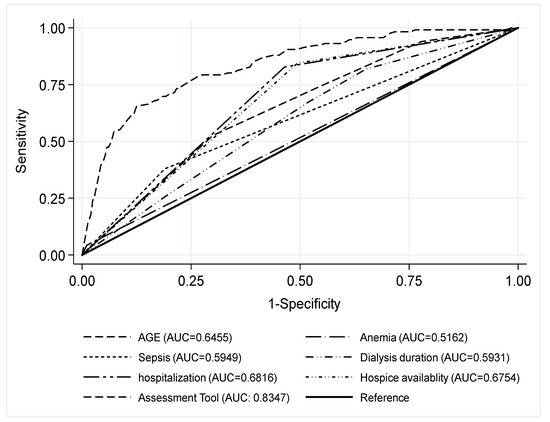 Receiver operating characteristic curve (ROC) for the key factors and patient assessment index for hospice care among non-cancer ESRD patients.
