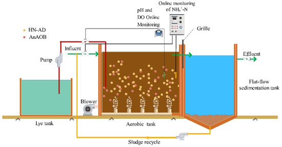 The one-stage SNDA process flow chart is shown in Figure 1, and contains an inlet pump, sludge circulating pump, aerobic tank, advection sedimentation tank, NH4+-N online monitoring, pH and DO online monitoring, lye tank and pump. The aerobic tank size is 40 m × 2.7 m × 2.45 m, with an effective volume of 216 m3. The sedimentation tank size is 40 m × 1.68 m × 2.45 m, with an effective volume of 131 m3. After being treated in the aerobic tank, the effluent from the secondary sedimentation tank flowed through the porous water distribution plate and baffle plate, and entered the advection sedimentation tank. After separating the mud water, the supernatant was discharged over the triangular weir. The sludge collected into the sludge bucket by the mud scraper was returned to the inlet of the aerobic tank via a circulating pump. An aeration device was placed at the bottom of the aerobic tank, and an NH4+-N online monitor, and pH and DO online monitor were installed at the end of the aerobic tank. The NH4+-N online monitor was used for operating and stopping the inlet pump, and regulating the NH4+-N concentration in the outlet water. When the NH4+-N value in the mixed liquid was lower than the lower limit of the NH4+-N online setting value, the inlet pump was run; when the NH4+-N value in the mixed liquid was higher than the upper limit of the NH4+-N online setting value, the inlet pump stopped. The alkali liquor pipe was evenly arranged along the body of the aerobic tank with 12 alkali liquor adding valves, and each alkali liquor valve was adjusted to ensure that the pH of the entire aerobic tank was maintained in the appropriate range. The pH online analyzer was used for operating and stopping the alkali pump. When the pH value in the mixed solution of the aerobic tank was lower than the lower limit of the pH online setting value, the alkali pump was run; when the pH value in the mixed solution of the aerobic tank was higher than the upper limit of the pH online setting value, the alkali pump stopped. One-stage SNDA records the changes in pH, DO, and NH4+-N content in real-time and regulates them according to the actual situation. During the process, the changes in pH, DO, and NH4+-N content were recorded in real-time and adjusted according to the actual situation.