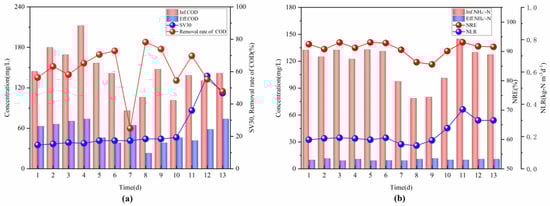Variation in the indicators during the start-up period: (a) concentration of COD, COD removal rate, and SV30 in the inlet and outlet water; (b) concentration of NH4+-N, NH4+-N removal rate (NRE), and NLR in the inlet and outlet water.