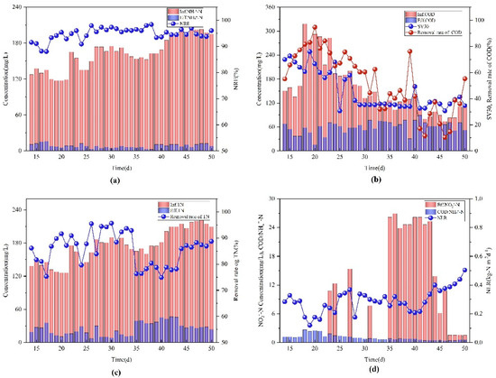 Changes in indexes during NLR domestication stage; (a) NH4+-N concentration and NRE in inlet and outlet water; (b) COD concentration in inlet and outlet water, COD removal rate and changes in SV30; (c) TN concentration and TN removal rate in inlet and outlet water; (d) effluent NO2−-N, NLR, and C/N.