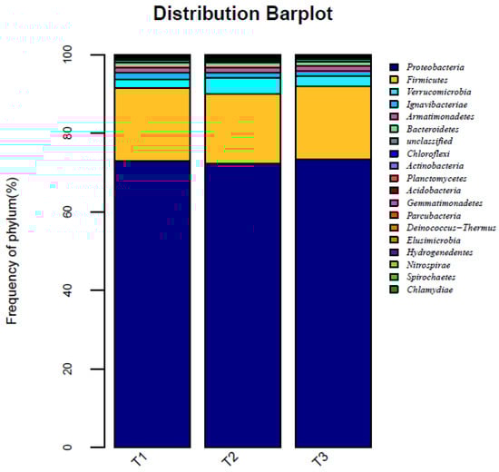 To more intuitively understand the changes in the microbial community structure and diversity, high-throughput sequencing technology, which is a molecular biology technology, was used to determine the microbial community structure in the sludge samples before and after the reactor start-up. The sludge was sampled thrice after the sludge domestication stage (T1, T2, and T3), and was transported to sangon Bioengineering (Shanghai) Co., Ltd., (Shanghai, China) for performing high-throughput sequencing analysis to analyze the changes in microbial diversity and identify the dominant strains. The analysis method performed was according to that described by Liu et al. [7].