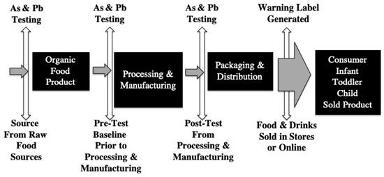 A schematic suggesting how to achieve As- and Pb-free food by sequential testing throughout the manufacturing process. This process aims to limit human As- and Pb-exposures, especially for infants, toddlers, and children. The grey directional arrows indicate the source-to-consumer process; the white double arrows indicate the testing phase for assuring As- and Pb-free foods; and the black boxes indicate the steps in the manufacturing process for achieving the production of As- and Pb-free foods from farm-to-table. The end goal is to establish clear limits for As and Pb in foods and drinks, and to inform the consumer through warning labels for all consumable goods sold in stores or online.