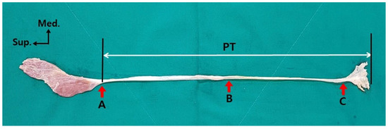 To measure the width and thickness of the PT, three measurement points were set: point A, the junction of the belly and the tendon; point B, the mid-point of the total length of the tendon; and point C, the point where the tendon begins to extend (Figure 1). The measured values of the width and thickness of each measurement reference point of the PT were used to calculate the average, standard deviation, median, and interquartile range. Each reference point identification and measurement was performed independently by two researchers. Three reference points were identified; two researchers measured once each and the average of those values was adopted as a value to describe the reference point. All values were measured with an electronic digital caliper (Sincon Corporation, Korea) with an error (precision) of 0.03 mm or less.