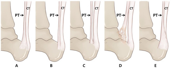 The morphology of the PT was then evaluated. Based on the criteria used in a previously reported classification [15], we classified the types according to the location and distribution area of the insertion to the calcaneal tuberosity.