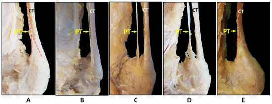 Photo of the classification of the PT according to insertion type. (A) Type 1; (B) Type 2; (C) Type 3; (D) Type 4; (E) Type 5. CT: calcaneal tendon; PT: plantaris tendon (red dashed line indicates plantaris tendon).