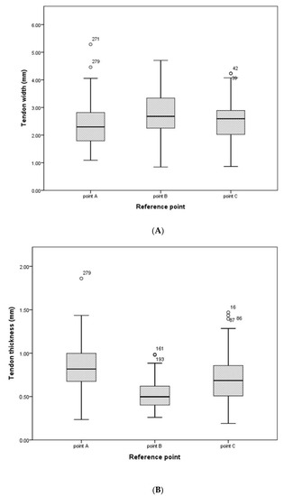 The means of the PT width by the reference point were 2.53 ± 0.92 mm for point A, 2.92 ± 0.90 mm for point B, and 2.61 ± 0.78 mm for point C. The means of the PT thickness by the reference point were 0.86 ± 0.29 mm for point A, 0.52 ± 0.16 mm for point B, and 0.69 ± 0.27 mm for point C (Table 2). To assist in identifying the changes in the thickness and width of the tendons by the reference point, a boxplot was created based on the median, range, and IQR (Figure 4).