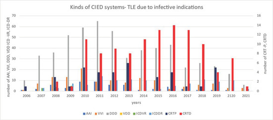 The annual number of TLEs due to infectious reasons varied from year to year. Most CRT systems were removed in 2014–2018 (Figure 1).