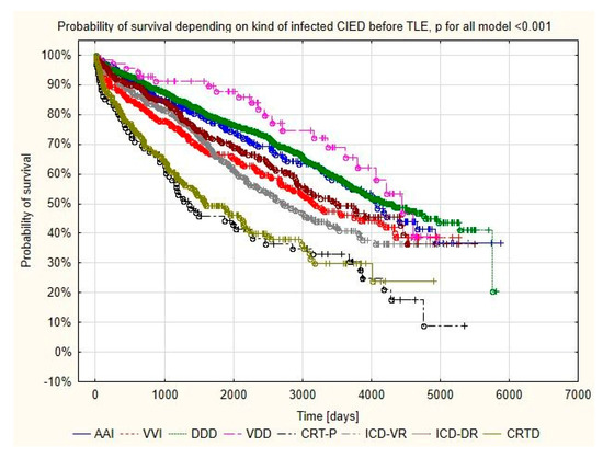 For the purposes of analysis, the study population with infective CIED was divided into five groups: 1—all pacemakers (AAI, VVI, DDD, VDD), 756 patients, 2—ICDs all (VVI, DDD), 232 patients, 3—CRT-P, 38 patients, 4—CRT-D, 112 patients, and 5—all CRT systems, 150 patients. Tables summarize the indications for the initial implantation of devices and present the specific patient-, system- and procedure-related risk factors as well as analyze complexity, efficacy, complications of the procedures and long-term mortality after TLE.