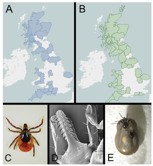Ixodes ricinus and tick-borne disease within Great Britain. (A) Map of the British Isles showing the distribution (in blue) of cases of tick-borne disease in cattle (tick-borne fever, babesiosis and louping ill) reported by APHA between 2012 and 2021. (B) Map of the British Isles showing the distribution (in green) of cases of tick-borne disease in sheep (tick-borne fever, louping ill and tick pyaemia) reported by APHA between 2012 and 2021. (C) Image of adult female Ixodes ricinus (photo Arran Folly). (D) Scanning electron micrograph of the mouth parts of an Ixodes ricinus larva (photo Bill Cooley). (E) Image of an engorged female Ixodes ricinus with males (photo Nicholas Johnson). Maps generated by APHA’s Surveillance Intelligence Unit accessible at APHA Vet Gateway: Livestock disease surveillance dashboards (defra.gov.uk, accessed on 18 April 2022) using software under licence from https://public.tableau.com (accessed on 18 April 2022).