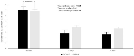 Shoulder Pain and Disability Index score was reported as mean ± S.E. The black bars represent the UGN plus BEN treatment group (CoTreatG), whereas gray bars represent the UGN-alone treatment (UGN-A). The differences between treatment were assessed with Linear Mixed Models, and were reported by the p-value for: Time, Treatment and the interaction between Time × Treatment.