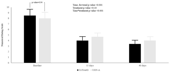Visual Analogue Scale score was reported as mean ± S.E. In black histograms the UGN plus BEN treatment group (CoTreatG) is represented, whereas in gray histograms the UGN-alone treatment (UGN-A) is represented. The differences between treatments were assessed with Linear Mixed Models, and were reported by the p-value for: Time, Treatment and the interaction between Time × Treatment.