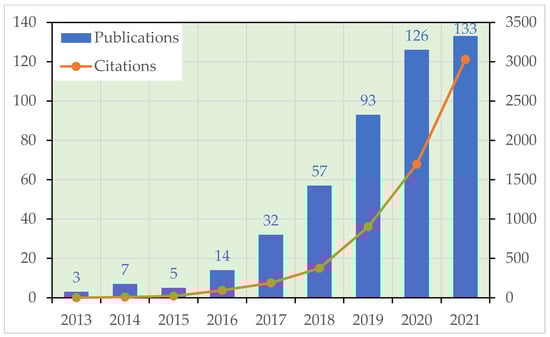 Since the BRI was first put forward in 2013, the ecology and environment of the “Belt and Road” regions have not obtained enough attention and there are few related publications from 2013 to 2015 (Figure 1). In 2016, the Chinese government released the 13th Five-Year Plan for ecological environment protection, which set the goals for a more environmentally friendly lifestyle, a considerable reduction in the discharge of pollutant emissions, effective control of environmental risks, and a sounder ecological system. As the concept of ecological civilization is deeply rooted in people’s hearts, promoting green Belt and Road to lead the international trend of green, low-carbon, and circular development is an inevitable and effective way to boost sustained and sound economic growth. In May 2017, relevant departments of the Chinese government jointly issued the “Guidance on Promoting a Green Belt and Road” [19] to further promote the green development of the Belt and Road regions. Therefore, the number of related references has grown exponentially since 2017 (Figure 1). In recent years, environmental discussions in the Belt and Road regions have been sprouting up. As the topic becomes more attractive, the number of citations also increases yearly (Figure 1), which confirms the value of the research.