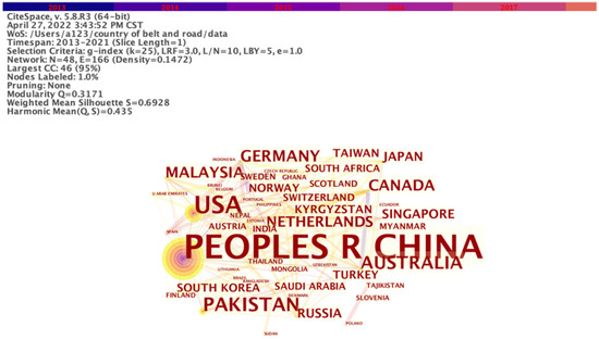 CiteSpace is a scientometric software that can be used to generate knowledge domain visualization and detect emerging trends in scientific literature [20,21]. The retrieved articles were imported into CiteSpace 5.8.R3 for further analysis following the process: Time Slicing set as “From 2013 to 2021”, Link set as Cosine, and Selection Criteria set as g-index = 25. After processing, we obtained the merged co-country network map with 48 notes and 166 links (Figure 2). Besides China, the main countries concerned about the ecological and environmental issues of the Belt and Road regions can be divided into 2 categories.