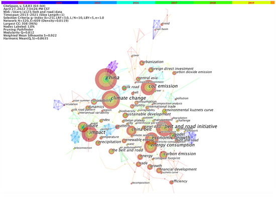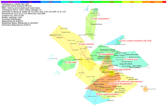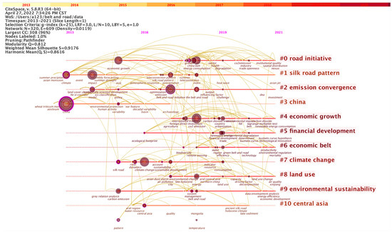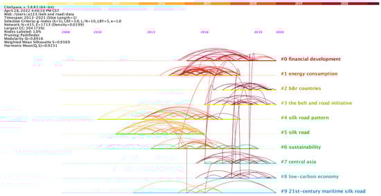 After calculation, 62 clusters were finally obtained. We selected the 10 largest clusters with tight relationships. Figure 6 shows that the BRI (Cluster #3) serves as an intermediary, linking different topics. Among them, financial development (Cluster #0) and low-carbon economy (Cluster #8) are closely tied up with the Belt and Road Initiative, reflecting the core pursuit of the Belt and Road construction. Energy trade is also an important issue in the Silk Road region. During the process of energy cooperation, the importance of Central Asian countries cannot be ignored and environmental sustainability must be taken into account.
