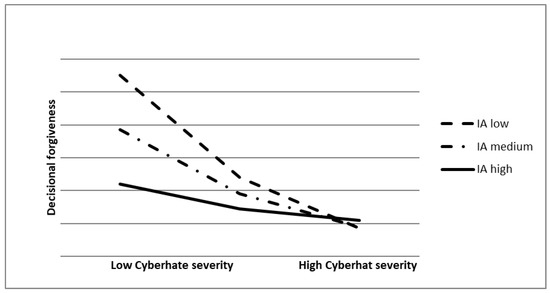 Our results confirmed the relationship between cyberhate severity and decisional forgiveness. According to scholars, there is an unquestionable link between the perceived severity of a transgression and forgiveness [12,37]. If a transgression is perceived as relatively minor, it is more likely to be forgiven. Deeply hurt people, on the other hand, find it harder to forgive [38]. Forgiveness requires a greater effort from them, e.g., Waldron and Kelly [38] indicated that direct strategies (e.g., discussing and being explicit about the transgression) are likely to induce forgiveness when the transgression is perceived as more severe. Our study makes a contribution to the knowledge concerning the link between wrongdoing severity and forgiveness by confirming the moderating role of Internet addiction. To our knowledge, Internet addiction, transgression severity, and forgiveness have not been tested in the same model, especially as far as cyberhate experience is concerned.