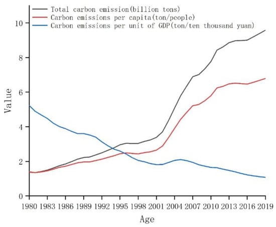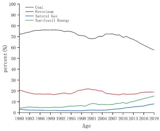According to the International Energy Agency, China is the world’s largest emitter of greenhouse gases (GHGs) accounting for 28.93% of global emissions, 94.60% of which was in the form of CO2 from fossil fuel combustion in 2019, according to the China Statistical Yearbook and the China Energy Statistical Yearbook. Indeed, China’s CO2 emissions per unit gross domestic product (GDP) exhibited a continuous downward trend between 1980 and 2019, falling from 5.23 to 1.08 tC· CNY 10,000−1 (Chinese Yuan—CNY); although, total CO2 emissions and per capita rates increased over the same period, rising from 1.38 to 9.58 billion tC, and from 1.39 to 6.79 tC·persosn−1, respectively (Figure 1). Despite these trends, China’s energy structure improved consistently from 1997 to 2019, as the share of fossil fuels dropped from 96.00% to 84.70%, chiefly due to the decreasing share of coal. Over the same period, the share of petroleum remained relatively unchanged, that of natural gas slowly grew, and the shares of non-fossil fuel energy sources (i.e., hydropower, nuclear power, solar power, and wind power) also grew consistently from 4.00% to 15.30%, equating to an increasing proportion of the country’s power generation structure from 19.36% to 31.15% (Figure 2).