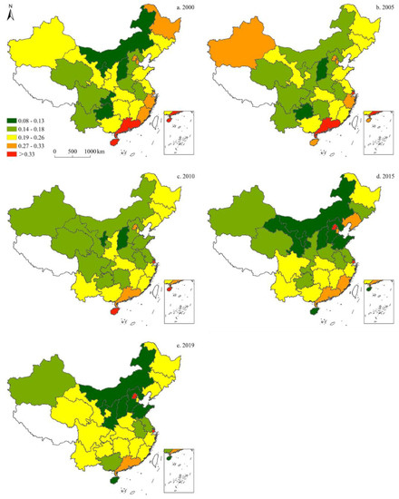 Figure 4 illustrates the provincial-level proportion of petroleum consumption in China’s energy structure. Since 2000, petroleum’s share has increased, and then declined, subsequently, resulting in relatively minor changes overall. Moreover, petroleum consumption varied by province: in 2000, Guangdong and Hainan demonstrated the highest share of petroleum, followed by Heilongjiang, Fujian, Zhejiang, Beijing, and Tianjin. In 2005, the share of petroleum in Xinjiang, Inner Mongolia, and Chongqing exhibited an upward trend; whereas the remaining provinces showed either a decline or no significant change. In 2010, petroleum’s share in Xinjiang, Ningxia, Shandong, Jiangsu, Guizhou, and Guangdong decreased; however, Gansu, Shaanxi, Yunnan, and Hainan saw an increase, while the remaining provinces showed no significant changes. In 2015, the provinces with the highest petroleum shares were Beijing and Shanghai, followed by Tianjin, Liaoning, Guangdong, and Fujian. In 2019, the highest shares of petroleum were found in Beijing and Shanghai, while the lowest were recorded in Inner Mongolia, Shaanxi, Shanxi, Hebei, Shandong, and Hainan.
