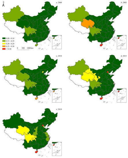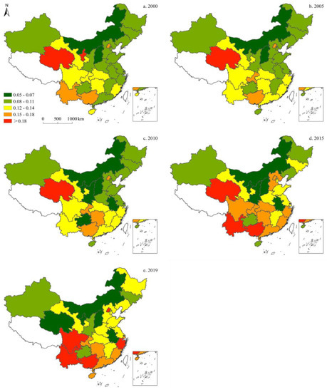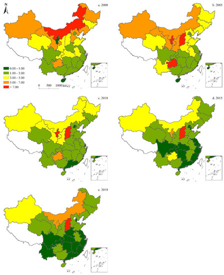 Since only data on carbon emissions from 1997 to 2019 can be collected, to demonstrate the spatiotemporal characteristics of China’s energy structure more clearly from 1997 to 2019, a visual analysis of the energy structure data was conducted, and the results were illustrated across five-time sections: 2000, 2005, 2010, 2015, and 2019. The results of these analyses are detailed as follows: