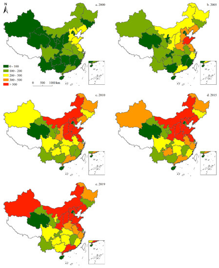 To more clearly demonstrate the spatiotemporal characteristics of total, per capita, and per unit GDP CO2 emissions in China between 1997 and 2019, this study conducted further visual analyses of the data, and illustrations are provided across five years: 2000, 2005, 2010, 2015, and 2019. The results of these analyses are detailed as follows: