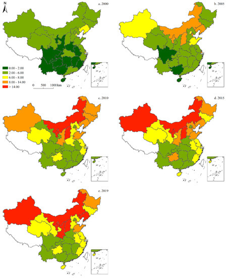 Figure 8 illustrates the provincial-level per capita CO2 emissions in China, revealing similar upward trends in total CO2 emissions since 2000. The distribution of maximum per capita CO2 emissions has gradually shifted from the east (Bohai Rim) to the central and western regions. Specifically, the province with the highest per capita emissions shifted from Liaoning to Shanxi over the last two decades. Regarding the pace of change, per capita CO2 emissions increased the fastest between 2000 and 2010, slowing gradually thereafter (Figure 8).