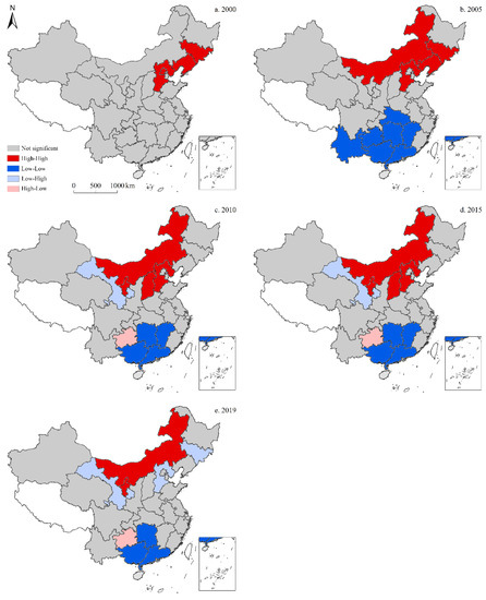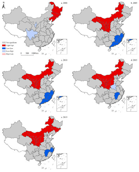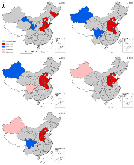 According to the local indicators of spatial association (LISA) map for the spatiotemporal distribution of total CO2 emissions (Figure 10), the high-high cluster in China exhibited regional clustering, with similar total CO2 emissions in 2000, 2005, 2010, 2015, and 2019. In 2000, the high-high cluster primarily included four provinces—Jilin, Hebei, Shandong, and Henan—and was distributed in strips along the northeast coast. Elsewhere, Gansu became part of the low-low cluster, which was located in the central and western regions; whereas neither low-high nor high-low clusters existed. In 2005, some changes were observed to this spatial divergence, as the high-high cluster primarily consisted of five provinces, including Hebei, Shandong, Henan, Shaanxi, and Anhui, while low-low clusters were comprised of two provinces—Xinjiang and Sichuan; however, as with 2000, no low-high or high-low clusters were observed. In 2010, high-high clusters showed no further expansion, although Sichuan became part of the high-low cluster. Alternatively, no changes were recorded in the low-low cluster either, while no low-high clusters were recorded. In 2015, the high-high cluster began to shrink to four primary provinces—Hebei, Shandong, Henan, and Shaanxi; whereas Xinjiang became part of the high-low cluster. Notably, both the low-low and low-high clusters were absent. In 2019, the high-high cluster continued to shrink down to three main provinces—Hebei, Shandong, and Henan—whereas the high-low cluster remained unchanged. Moreover, Sichuan became part of the low-low cluster, while the low-high cluster remained absent.