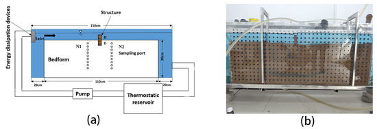 Schematic diagram (a) and actual diagram (b) of experimental apparatus. The light gray and blue areas represent the parts filled with sand and water, respectively. The dark gray rectangle on the sand bed is the weir set in the experiment. N1 and N2 are two rows of sampling holes with a distance of 5 cm to the structure.