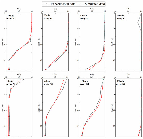 Comparison between the measured (black curves) and simulated (red curves) solute concentrations varying with depth.