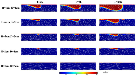 The simulation results are shown in Figure 4. The depth of solute transport increased with increasing time, and the solute exchange region expanded. The depth of solute transport (Dp) increased with H/D; for example, when T = 8 h, the Dp was 0.08 m, 0.14 m, 0.22 m, 0.36 m, and 0.65 m at H = 1 cm, 2 cm, 3 cm, 4 cm, and 5 cm, respectively.