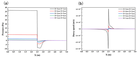 SWI pressure distribution diagram (a) and velocity distribution diagram (b) under the influence of structural H and D changes. Channel flow is left to right.