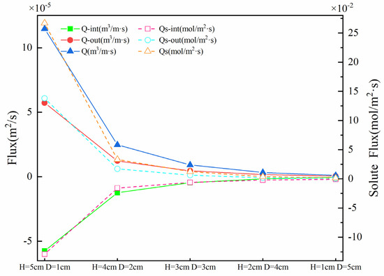 The magnitude of the vertical flux and solute flux induced by a weir could be viewed as decisive metrics of hyporheic exchange. Figure 6 shows the upwelling flux Qout, downwelling flux Qint, and SWI interface solute exchange capacity Qs under different H and D. On the whole, with the increase in H and the decrease in D, the upwelling flux (4.68 × 10−7~5.73 × 10−5 m2·s−1) and the downwelling flux (−5.20 × 10−7~−5.74 × 10−5 m2·s−1) showed an increasing trend, and the total flux Q increased with the increase in H (9.88 × 10−7~1.15 × 10−4 m2·s−1). Qs had a similar trend, and the total flux of solute exchange increased from 1.51 × 10−3 mol/(m2·s) to 2.67 × 10−1 mol/(m2·s).