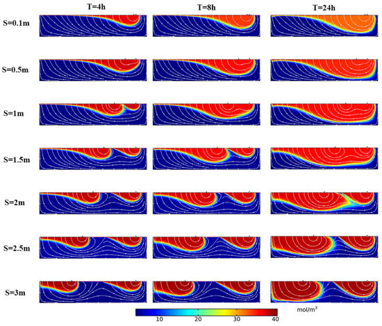 The simulation results are shown in Figure 7. The depth of solute transport increased with increasing time, and the solute exchange region expanded. When the T was 8 h, the depth of the solute front increased when the structure spacing S increased from 0.1 m to 1 m, and the Dp were 0.64 m, 0.72 m, 0.74 m, respectively. When the structural spacing S continued to increase to 1.5 m, 2 m, 2.5 m, and 3 m, the Dp were 0.68 m, 0.67 m, 0.66 m, and 0.68 m, respectively, indicating that when the structural spacing S increases, the solute front depth Dp increases at first and then decreases when S continues to increase to a certain value.