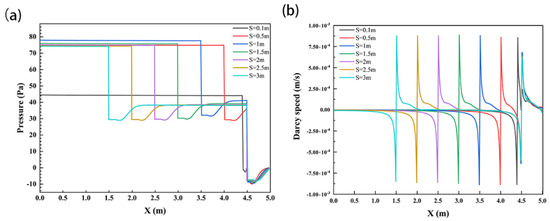 To further analyze the influence of structural spacing on solute transport in the subsurface flow zone, the interface pressure and velocity of sediments were analyzed, as shown in Figure 8. The SWI pressure values of each working condition showed a slightly decreasing trend on the structure; they decreased abruptly near the structure and then increased. Comparing these working conditions, it could be found that the pressure value first increased and then decreased with increasing structural spacing. The maximum values were 44.55 Pa, 75.26 Pa, 78.04 Pa, 76.1 Pa, 75.1 Pa, 74.6 Pa, and 74.3 Pa at S = 0.1 m, 0.5 m, 1 m, 1.5 m, 2 m, 2.5 m, and 3 m, respectively. At the same time, the structure significantly changed the velocity distribution on the SWI, but the maximum velocity value did not change significantly with the increase in S, all of which were approximately 8.8 × 10−4 m/s.