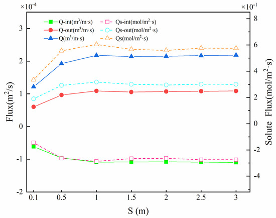 Figure 9 shows the upwelling flux Qout, downwelling flux Qint, and SWI interface solute exchange capacity Qs under different S. On the whole, with the increase in structural spacing S, the upwelling flux (6.01 × 10−5~1.09 × 10−4 m2·s−1) and the downward flux (−6.15 × 10−5~−1.10 × 10−4 m2·s−1) first increased and then decreased, and the total flux Q first increased and then remained unchanged (1.22 × 10−4~2.18 × 10−4 m2·s−1). The trend of Qs was different; the total flux of solute exchange increased from 3.35 × 10−1 mol/(m2·s) to 6.04 × 10−1 mol/(m2·s) and then decreased to 5.59 × 10−1 mol/(m2·s).