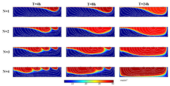 The simulation results are shown in Figure 10. The solute transport depth Dp increased with increasing time, and the solute exchange region increased obviously. By comparing the conditions of different numbers, it could be seen that the Dp increased with the structure number N; for example, when T = 8 h, the Dp was 0.6 m, 0.7 m, 0.73 m, and 0.77 m at N = 1, 2, 3, and 4, respectively, which indicated that increasing the number of structures could significantly increase the solute exchange depth in the HZ and expand the exchange range.