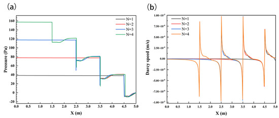 To further analyze the influence of the number of structures on the solute transport in the subsurface, the pressure and velocity of the sediment interface were analyzed, as shown in Figure 11. N showed positive relationships with the SWI pressure; the maximum values were 38.5 Pa, 78 Pa, 118 Pa, and 157 Pa at N = 1, 2, 3, and 4, respectively. At the same time, the setting of the structure significantly changed the flow velocity distribution on the SWI, and the velocity increased with the number of structures; the maximum velocity values were 6.09 × 10−4 m/s, 8.88 × 10−4 m/s, 9.75 × 10−4 m/s, and 9.79 × 10−4 m/s at N = 1, 2, 3, and 4, respectively.