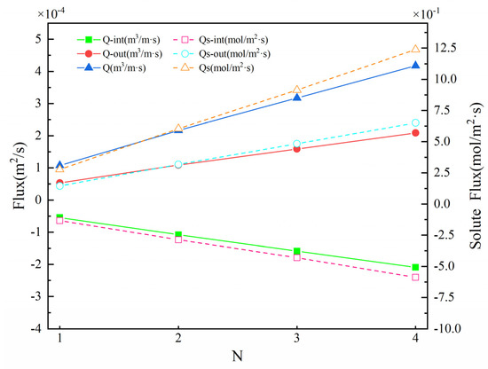 Vertical hyporheic exchange flux (Q), downwelling hyporheic flux (Qint), upwelling hyporheic flux (Qout), solute flux (Qs), downwelling solute flux (Qs-int), and upwelling solute flux (Qs-out) under different N values. The solid lines represent the hyporheic exchange flux; the dashed lines show the solute flux.