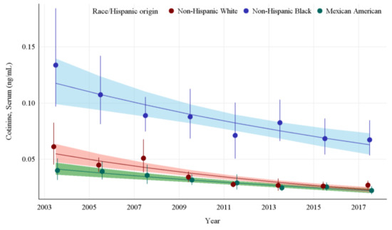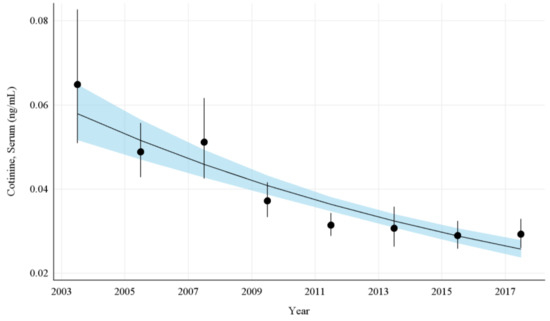 Data analyses were performed using SAS version 9.4 (SAS Institute Inc., Cary, NC, USA). Measurements below the LOD were replaced with LOD/√2. Statistical analyses were conducted using the NHANES examination sample weights as described in the NHANES analytical guidelines (https://wwwn.cdc.gov/nchs/nhanes/analyticguidelines.aspx (accessed on 2 February 2022)). Due to substantial right skew, serum COT concentrations were log transformed. To study changes in serum COT concentrations within the period 2003–2018 for U.S. nonsmokers exposed to SHS, we calculated sample-weighted GM serum COT concentrations by NHANES cycle and by race and Hispanic origin (non-Hispanic Black, Mexican American, non-Hispanic White, or other Hispanic/other race/multi-racial), age group (3–5, 6–11, 12–19, 20–39, 40–59, 60–85 years), and sex (males, females). Where applicable, we noted GM concentrations that did not meet the statistical reliability criterion of biomarker results greater than 60% above the LOD (Appendix A Table A2). Pairwise comparisons were conducted on GM serum COT concentrations across different survey cycles and demographics, and Bonferroni correction was used to adjust for multiple comparisons (Appendix A Table A3). To investigate the trend in serum COT concentrations from 2003–2004 to 2017–2018, we constructed a sample-weighted log-linear regression model, with serum COT concentration as the dependent variable and NHANES survey cycle as the independent variable. The average percent change and its 95% confidence interval (CI) were calculated per survey cycle by exponentiating the regression coefficients and their corresponding CIs. We also examined changes in serum COT concentration over time and across demographic groups via log-linear regression models, with NHANES survey cycle and either age group, sex, or race and Hispanic origin, and their respective interactions with NHANES survey cycle, as predictors (Appendix A Table A4, Table A5, Table A6 and Table A7). Statistical significance was set at α ≤ 0.05.