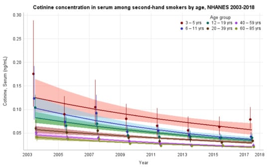 Our findings of decreased SHS exposure as measured by GM of serum COT concentrations among all age groups, including children, is consistent with a recent report from Tatten-Birch and Jarvis that showed a 90% decrease in SHS exposure among children aged 4–15 years in England from 1998 to 2018 [29]. Disparities in SHS exposure between children and adults have been noted previously and persist [16]. This may be partially explained by research showing the home is the primary source of exposure for children, and nearly all nonsmokers who live with a smoker are exposed to SHS [30]. Furthermore, children may be less aware of the health consequences of SHS exposure and less able to distance themselves from a smoker in their home. Encouraging voluntary smoke free rules in the home and inside vehicles as well as promoting cessation in adult smokers have been identified as potential interventions to reduce SHS exposure and its related health hazards in children [31,32].