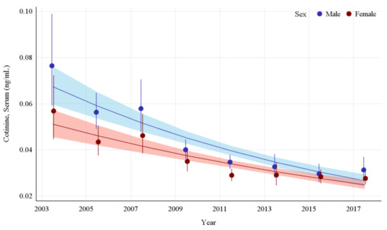 The GMs and 95% CIs for serum COT concentrations in U.S. nonsmokers by sex from 2003 to 2018 are depicted in Figure 4 along with the log-linear regression lines for each sex. COT concentrations for both the male and female populations dropped significantly during this survey period, by 59.1% (p < 0.0001) and 51.3% (p < 0.0001), respectively. The rate of decline in serum COT concentrations for females was 9.8% per NHANES survey cycle. While males had significantly higher (p < 0.0001) concentrations of serum COT initially, their concentrations declined faster (p = 0.0002) than females during this period (Appendix A Table A7). Despite a decrease in the disparity between their exposures over time, a pairwise comparison of these groups during the most recent survey period (2017–2018) showed that the differences between males and females remained significant, with males having approximately 13.2% (p = 0.0384) higher serum COT concentrations than females (Table 2).