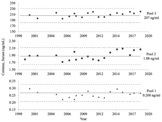 Serum samples were measured in analytical runs that included aliquots from two distinct QC pools. These QC pools contained known analyte concentrations consistent with the serum COT concentrations of nonsmokers and people who smoke. QC pools were created from stock pools of human serum: a low stock pool from nonsmokers with minimum exposure to SHS, and a high stock pool from people who use tobacco products. These pools then were analyzed and combined to achieve target analyte concentrations [21]. The first QC pools for the COT assay were characterized in 1992 with the following concentrations: 0.268 ng/mL (95% confidence interval (CI) [0.208, 0.328]), 1.88 ng/mL (95% CI [1.64, 2.12]), and 207 ng/mL (95% CI [182, 232]) COT. All QC pools were homogenized, aliquoted into individual vials, and stored at −60 °C.