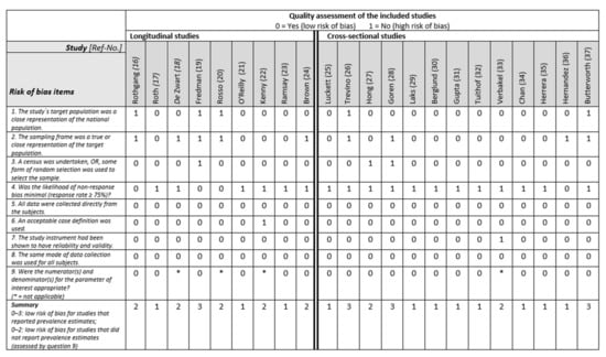 - Hoy, D.; Brooks, P.; Woolf, A.; Blyth, F.; March, L.; Bain, C.; Smith, E.; Buchbinder, R. Assessing risk of bias in prevalence studies: Modification of an existing tool and evidence of interrater agreement. J. Clin. Epidemiol. 2012, 65, 934–939. [Google Scholar] [CrossRef]