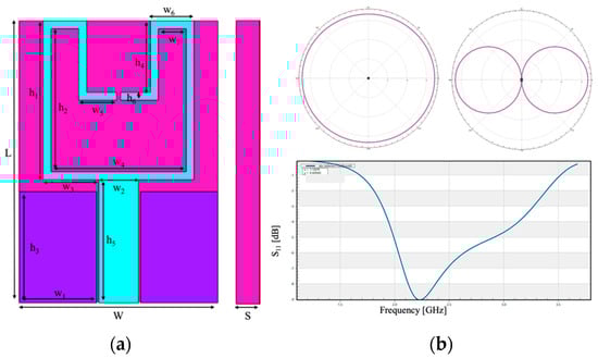 Simulated wearable patch antenna tuned at f = 2.45 GHz. (a) front view and the side view and (b) performance of the simulated antenna: on the upper part the radiation patterns of the antenna (on the left with phi = 0°, on the right with theta = 90°); on the lower part, the reflection coefficient centered on the frequency f = 2.45 GHz.