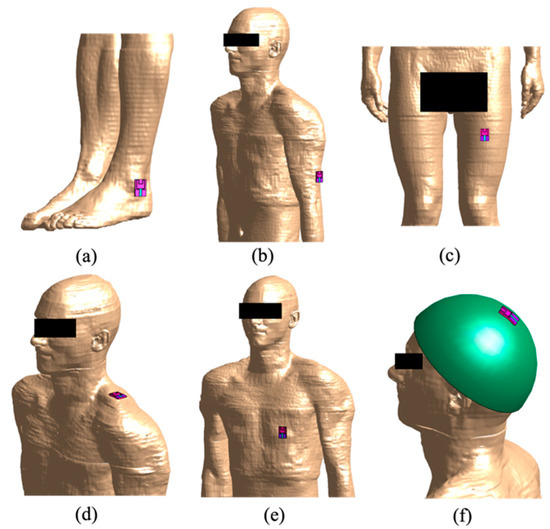 Overview of the six simulated exposure configurations on Duke for the antenna tuned at f = 2.45 GHz: (a) antenna on the ankle, (b) on the arm, (c) on the leg, (d) on the shoulder, (e) On the torso at the height of the heart and (f) on the head, placed on a steel helmet.